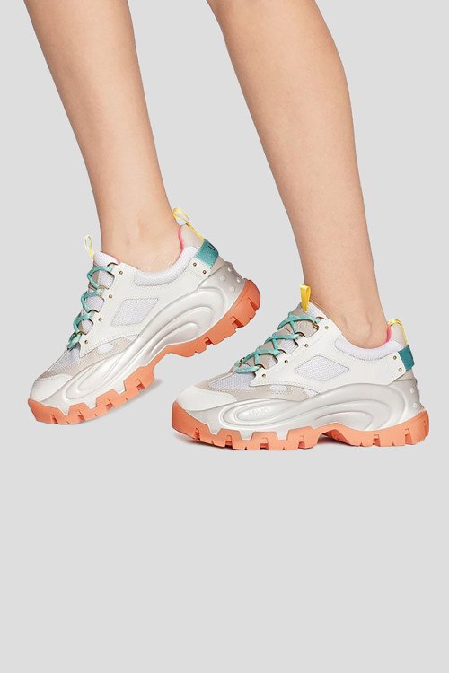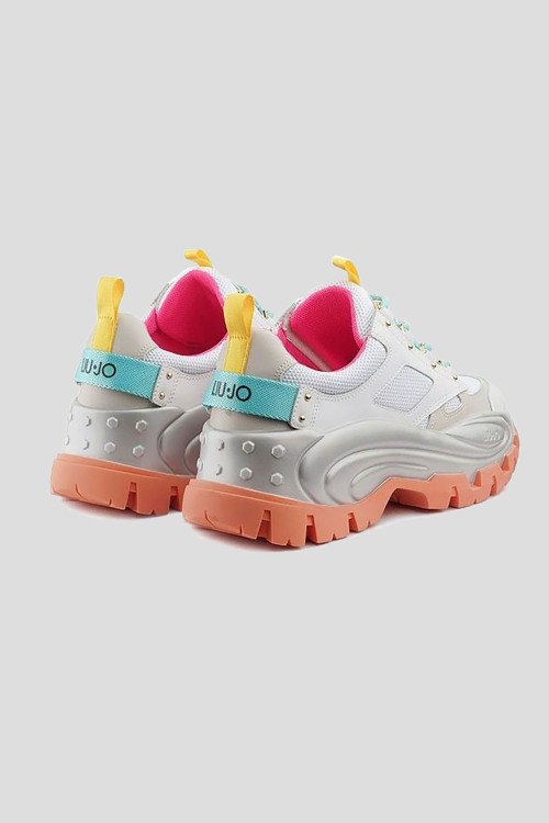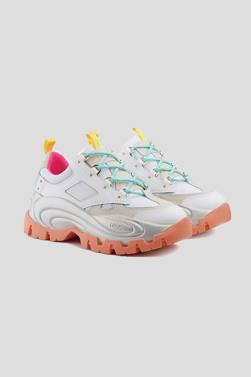 Женские белые кожаные кроссовки Wave 01 от Liu Jo (Лиу Джо). Комбинация материалов, две петли для подтягивания, тесьма с логотипом, классическая шнуровка, закругленный носок, массивная подошва