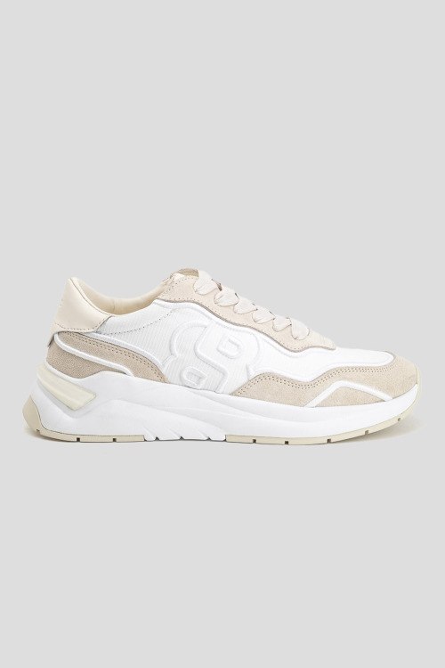 Детали: Женские бело-бежевые кроссовки Skylar Runn из полиэстера и замши от Hugo Boss (Хуго Босс). Комбинация цветов и материалов, закругленный носок, спереди шнуровка, вышитый логотип бренда, патч-лого