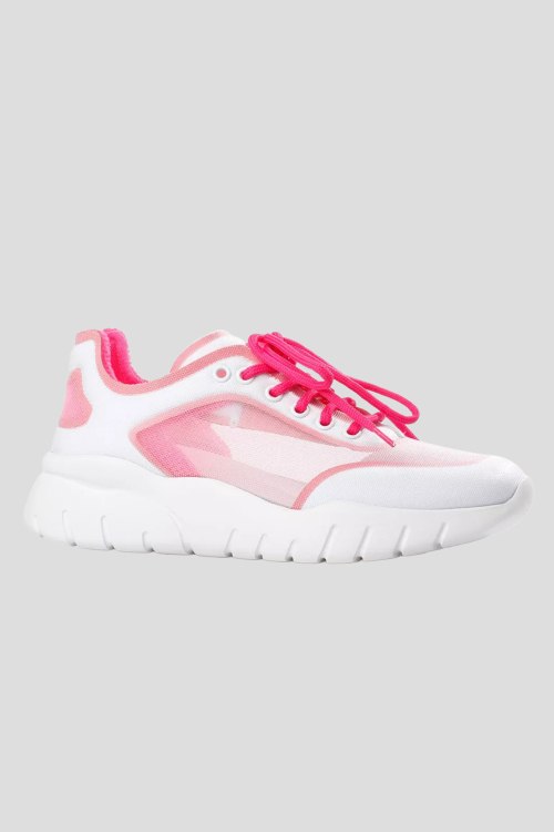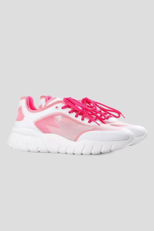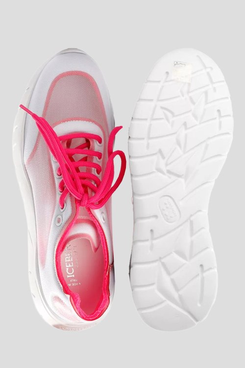 Детали: Женские бело-розовые кроссовки из кожи и текстиля от Iceberg (Айсберг). Комбинация материалов, полупрозрачные вставки, классическая шнуровка, закругленный носок