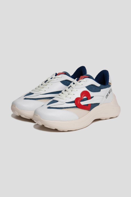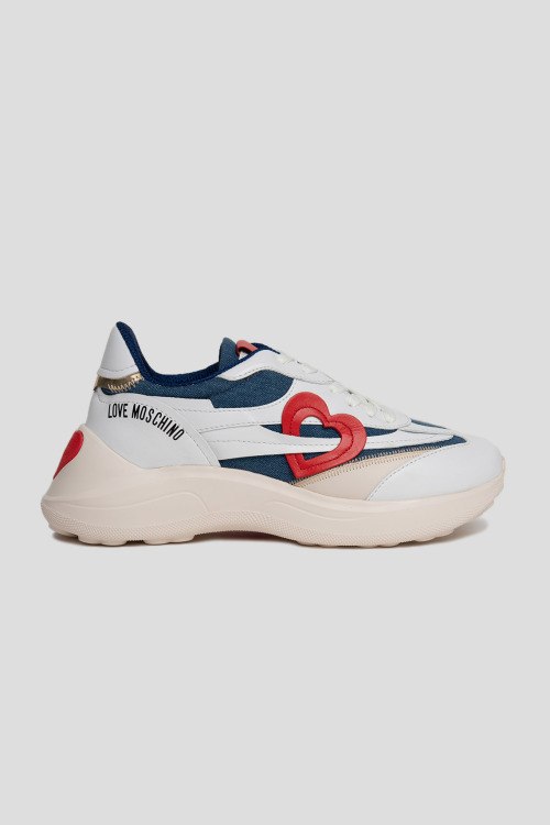 Детали: Женские белые кроссовки из кожи и текстиля от Love Moschino (Лав Москино). Закругленный носок, комбинированный дизайн, спереди классическая шнуровка, патч-лого, контрастные нашивки, массивная подошва белого цвета