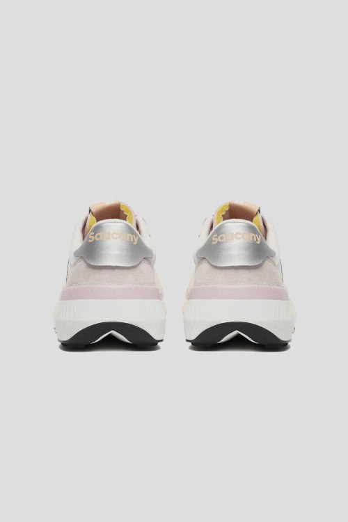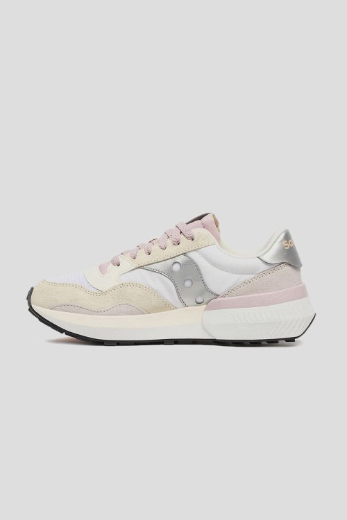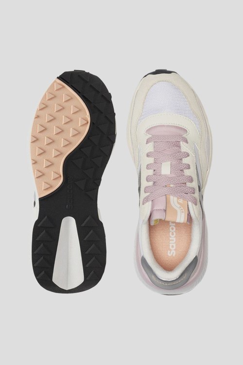 Детали: Женские бело-бежевые кроссовки из замши и текстиля Jazz NXT от Saucony (Сайкони). Комбинация цветов и материалов, логотип сбоку и на язычке, классическая шнуровка, закругленный носок, резиновая подошва