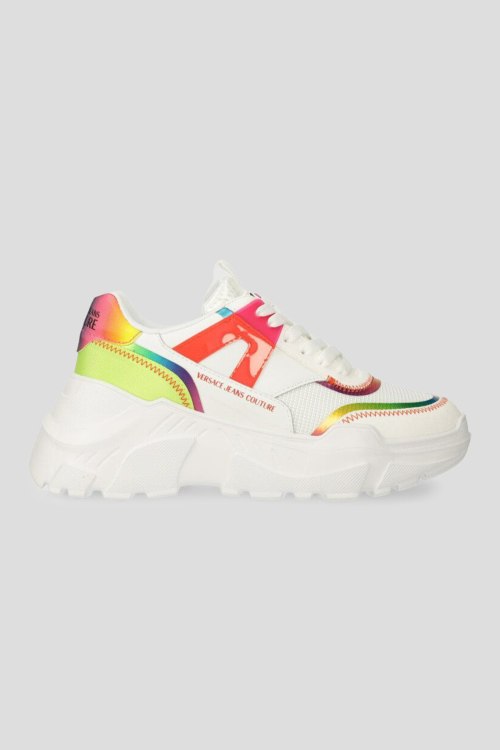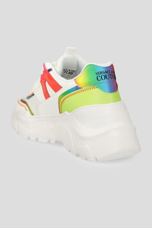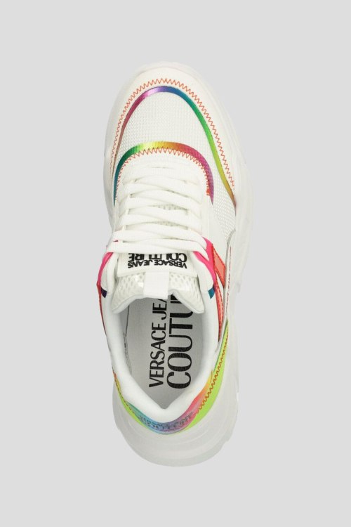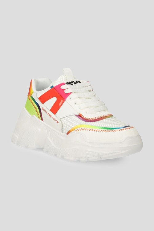 Детали: Женские белые кроссовки из экокожи и текстиля от Versace Jeans Couture (Версаче Джинс Кутюр). Закругленный носок, спереди классическая шнуровка, дизайн в виде комбинации цветов и материалов, массивная подошва, принт с логотипом бренда. Высота платформы: 5 см.