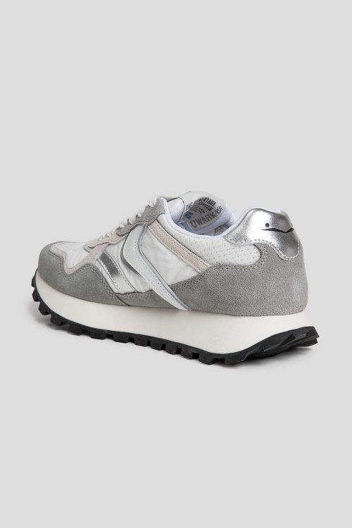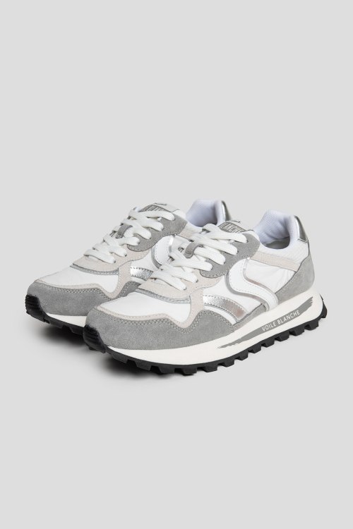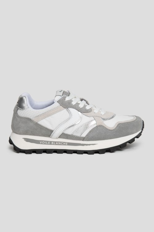 Детали: Женские бело-серые кроссовки из замши и текстиля от Voile Blanche (Вуаль Бланш). Комбинация цветов и материалов, логотип на язычке, классическая шнуровка, закругленный носок, белая подошва