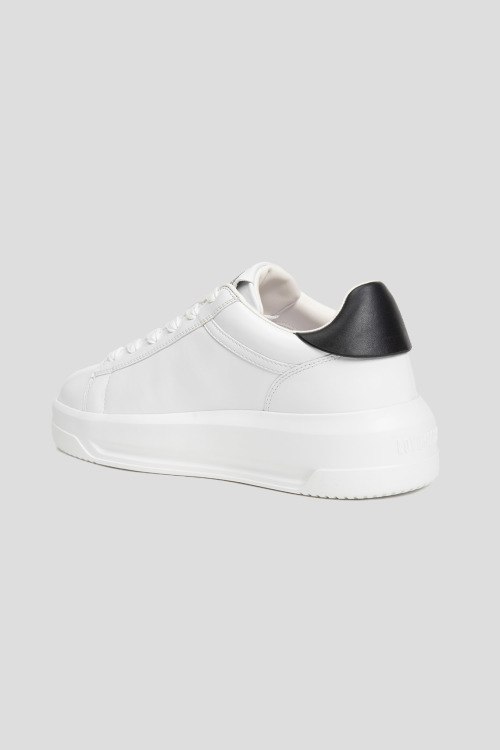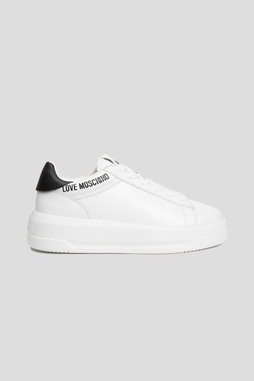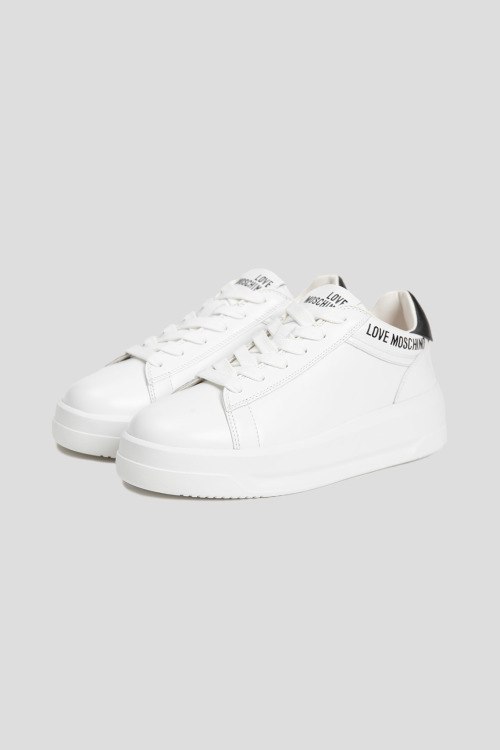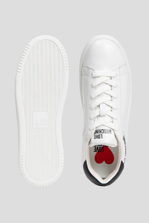 Детали: Женские белые кеды из натуральной кожи от Love Moschino (Лав Москино). Закругленный носок, спереди шнуровка, логотип бренда, контрастная вставка на заднике, резиновая подошва в тон изделия