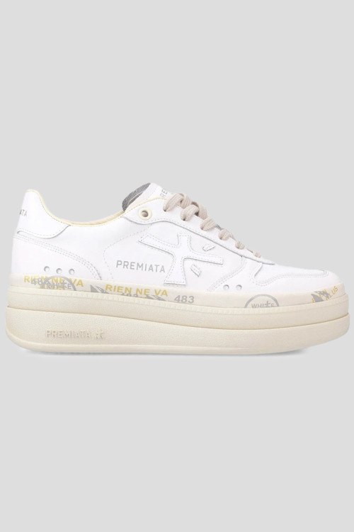 Детали: Женские белые кожаные кроссовки Micol от Premiata (Премиата). Модель из гладкой кожи, логотип сбоку, на язычке и на пятке, классическая шнуровка, закругленный носок, брендированная массивная подошва