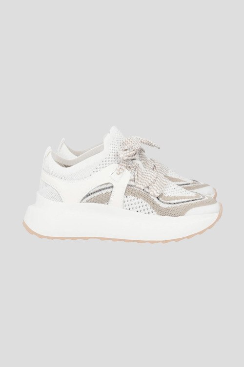 Детали: Женские белые кроссовки из текстиля и кожи от Tosca Blu (Тоска Блу). Дизайн в виде комбинации цветов и материалов, закругленный носок, спереди классическая шнуровка, массивная подошва, патч-лого