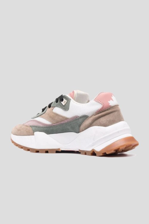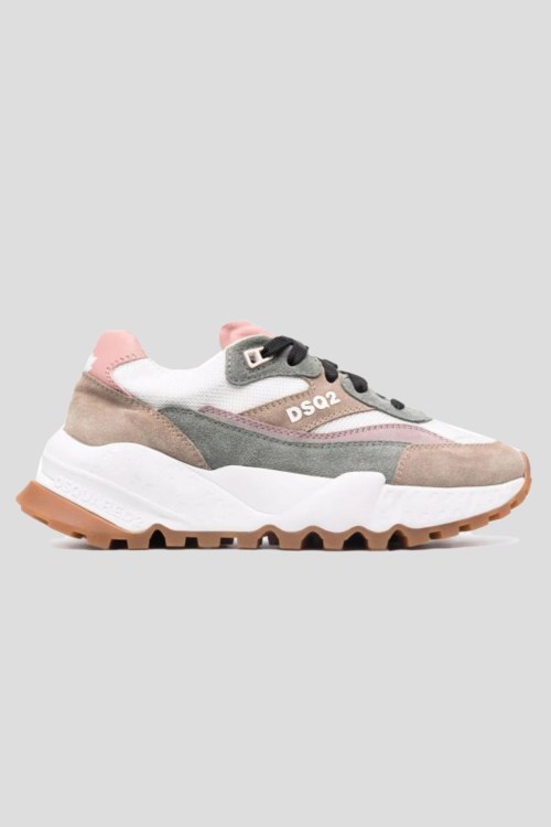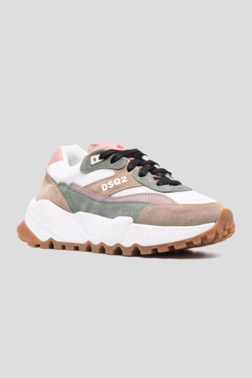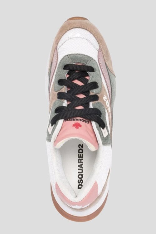 Детали: Женские бежевые кроссовки из натуральной замши и натуральной кожи от Dsquared2 (Дискваред). Миндалевидный носок, спереди классическая шнуровка, дизайн в виде комбинации цветов и материалов, массивная рельефная подошва