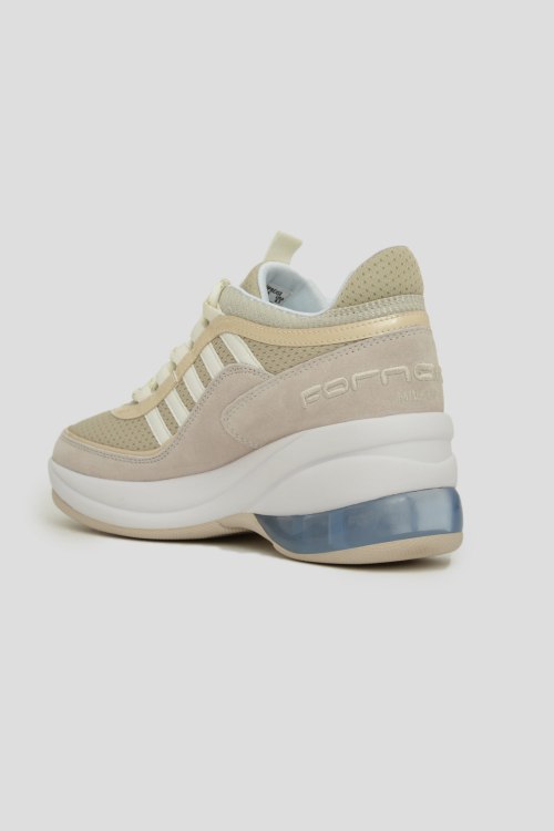 Текстильные кроссовки бежевого цвета, однотонная модель, закругленный носок, классическая шнуровка, фирменный логотип бренда