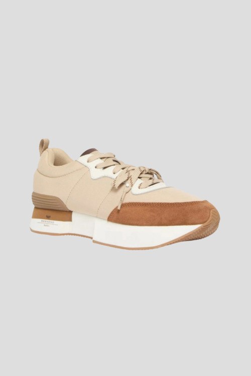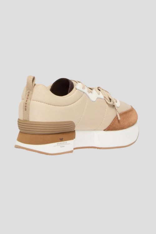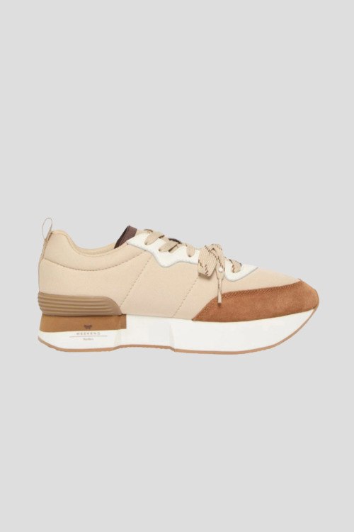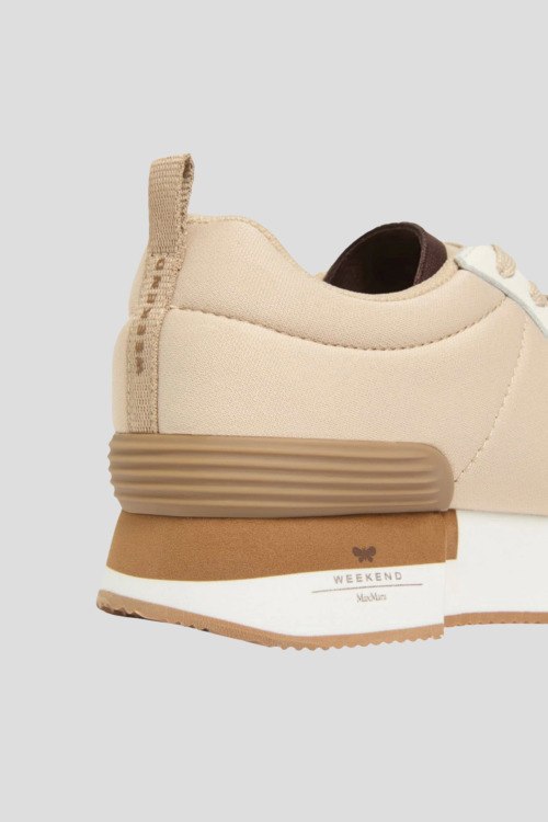 Детали: Женские бежевые кроссовки из текстиля и замши Zambra от Max Mara Weekend (Макс Мара Викенд). Комбинация материалов, логотип на язычке, классическая шнуровка, петля для подтягивания сзади, закругленный носок