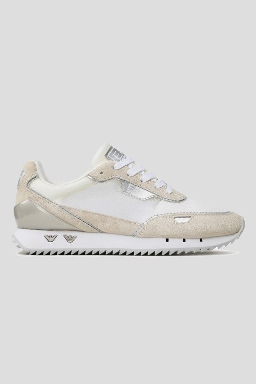 Детали: Женские бежевые кроссовки из натуральной кожи и текстиля от EA7 Emporio Armani (ЕА7 Эмпорио Армани). Дизайн в виде комбинации цветов и материалов, сетчатые вставки по бокам, спереди классическая шнуровка, патч-лого на язычке, рельефная подошва