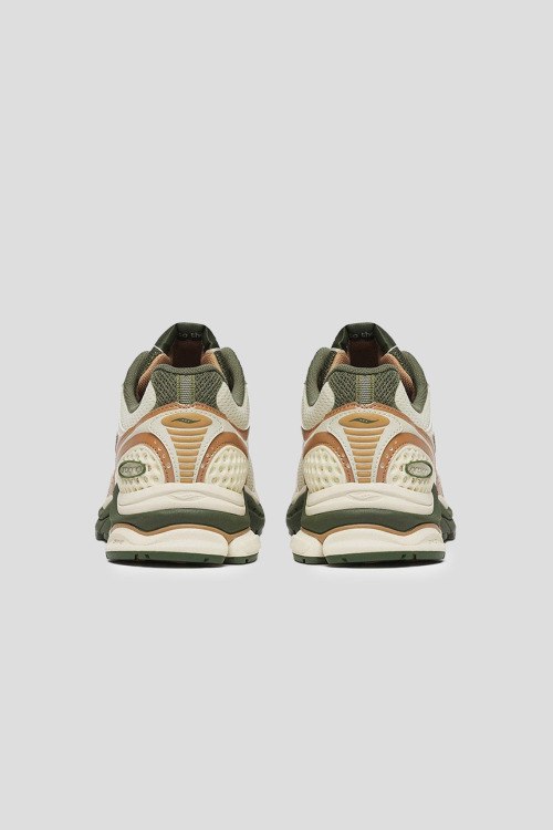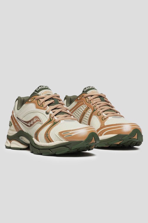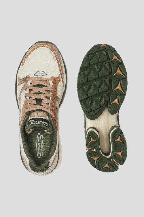 Детали: Женские бежевые кроссовки ProGrid Triumph 4 из текстиля и экокожи от Saucony (Сайкони). Дизайн в виде комбинации цветов и материалов, закругленный носок, спереди классическая шнуровка, логотип бренда, рельефная подошва