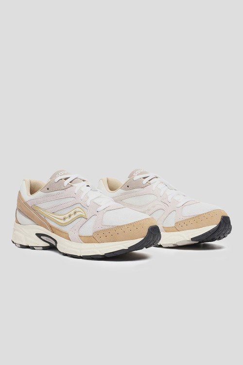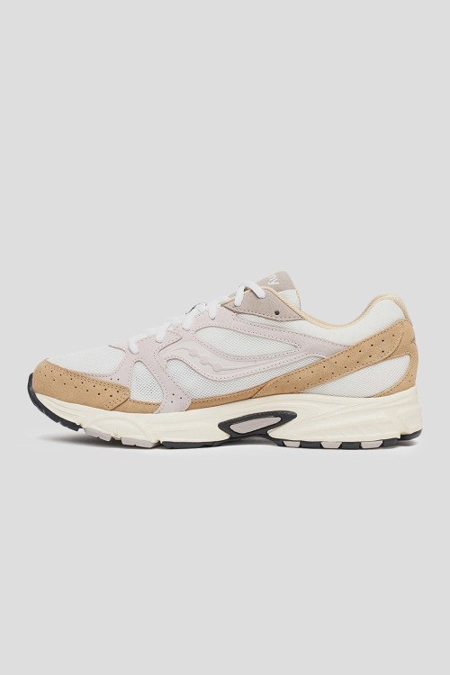 Детали: Женские бело-бежевые кроссовки Ride Millennium из экокожи и текстиля от Saucony (Сайкони). Закругленный носок, спереди шнуровка, комбинация материалов, рельефная подошва, брендированные вставки