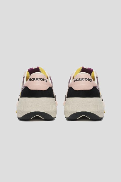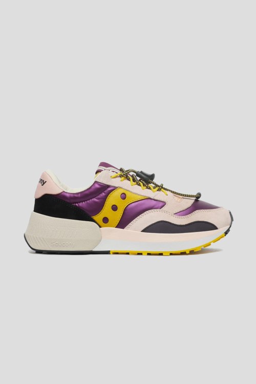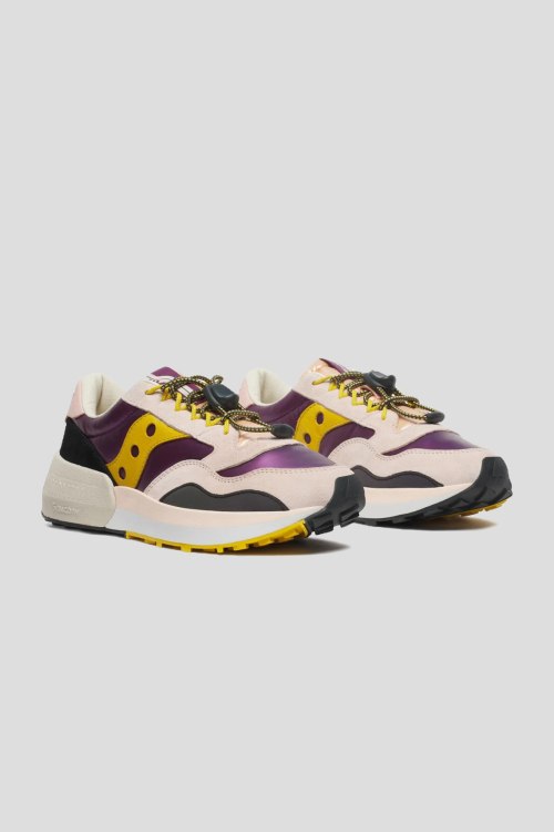 Женские фиолетово-бежевые кроссовки Jazz Nxt из текстиля и нейлона от Saucony (Сайкони). Дизайн в виде комбинации цветов и материалов, закругленный носок, спереди шнуровка с утяжкой, массивная подошва, патч-лого