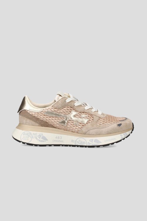 Детали: Женские бежевые кроссовки Lauryn из натуральной замши и текстиля от Premiata (Премиата). Комбинация материалов, перфорация, спереди классическая шнуровка, брендированные вставки, рельефная подошва