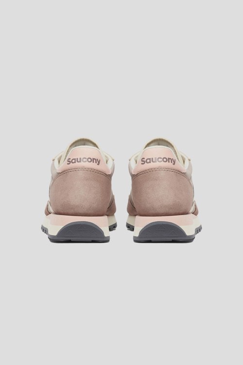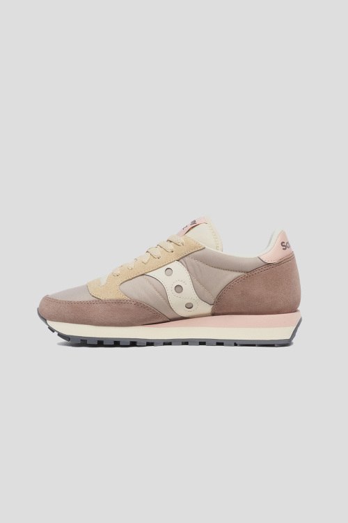 Детали: Женские бежевые кроссовки Jazz Original из кожи и текстиля от Saucony (Сайкони). Комбинированный дизайн, закругленный носок, спереди классическая шнуровка, патч-лого на языке, брендированные вставки, рельефная подошва
