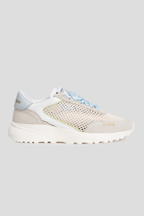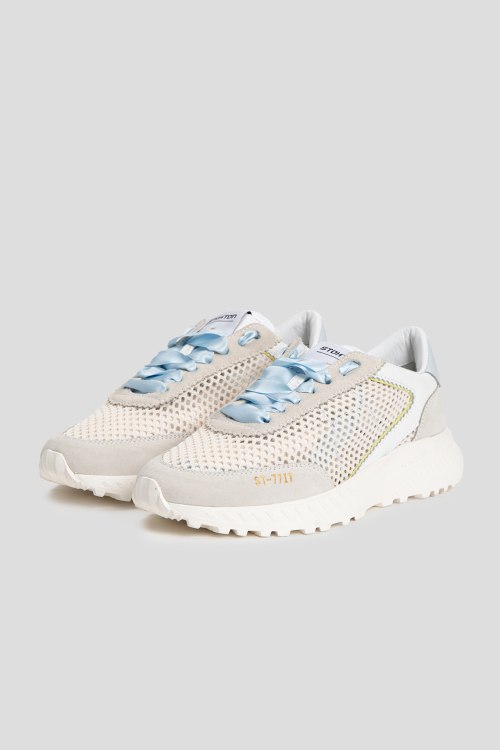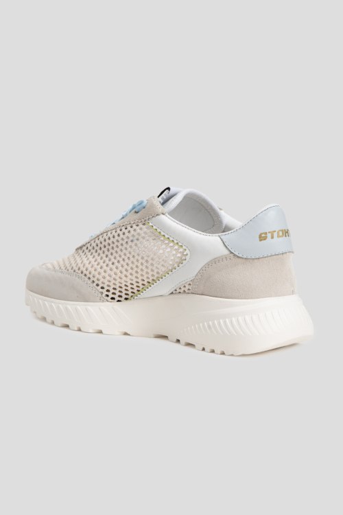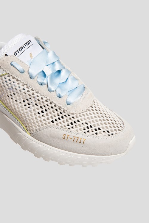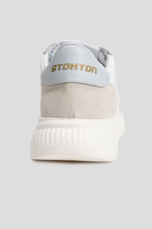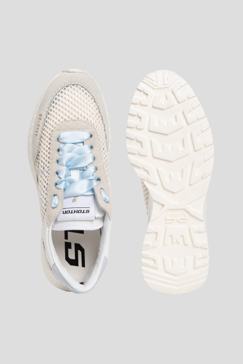 Детали: Женские бежевые кроссовки из текстиля и замши от Stokton (Стоктон). Закругленный носок, перфорированный дизайн, патч-лого, атласная голубая шнуровка, рельефная подошва
