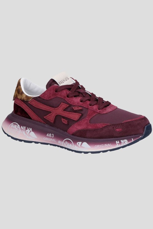Детали: Женские бордовые кроссовки из замши и текстиля Lauryn от Premiata (Премиата). Комбинация материалов, логотип сбоку и на язычке, классическая шнуровка, закругленный носок, брендированная подошва