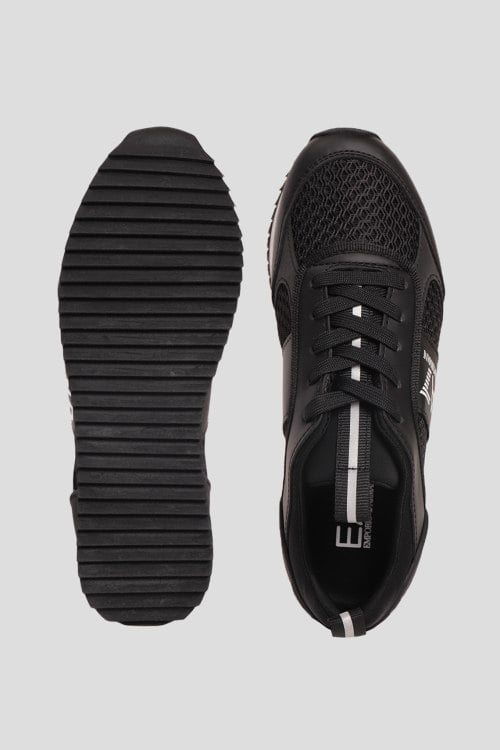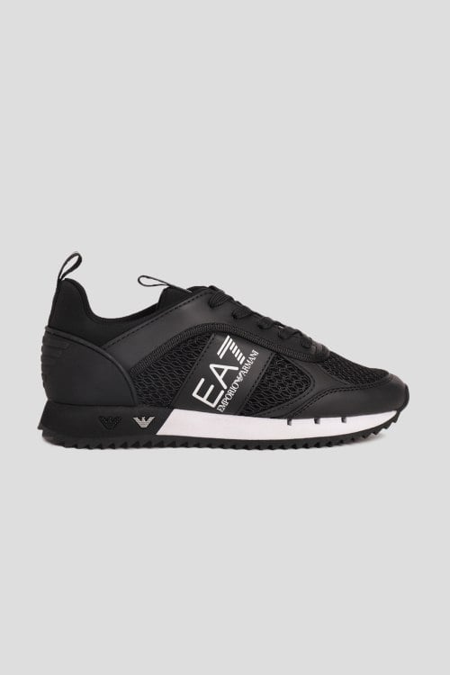 Детали: Женские черные кроссовки из экокожи и текстиля от EA7 Emporio Armani (ЕА7 Эмпорио Армани). Комбинация материалов, логотип сбоку, две петли для подтягивания, классическая шнуровка, закругленный носок, резиновая подошва