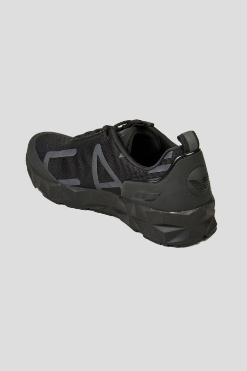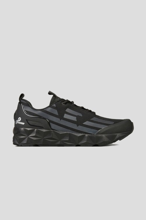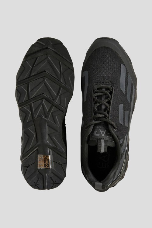 Детали: Женские черные текстильные кроссовки Ultimate от EA7 Emporio Armani (ЕА7 Эмпорио Армани). Резиновые вставки, логотип сбоку и на язычке, классическая шнуровка, две петли для подтягивания, закругленный носок