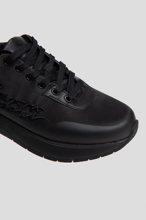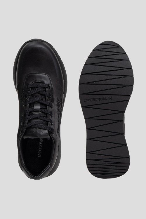 Детали: Женские черные кроссовки из кожи и текстиля от Emporio Armani (Эмпорио Армани). Комбинация материалов, логотип сбоку и на язычке, классическая шнуровка, закругленный носок