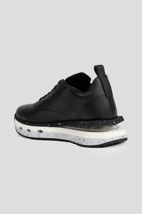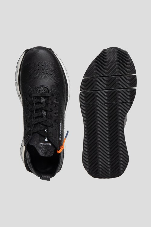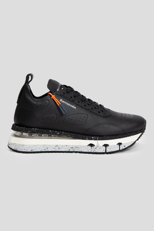 Женские черные кожаные кроссовки от Barracuda (Барракуда). Модель из зернистой кожи, логотип сбоку и на язычке, перфорированные элементы, классическая шнуровка, петля для подтягивания сзади, закругленный носок.