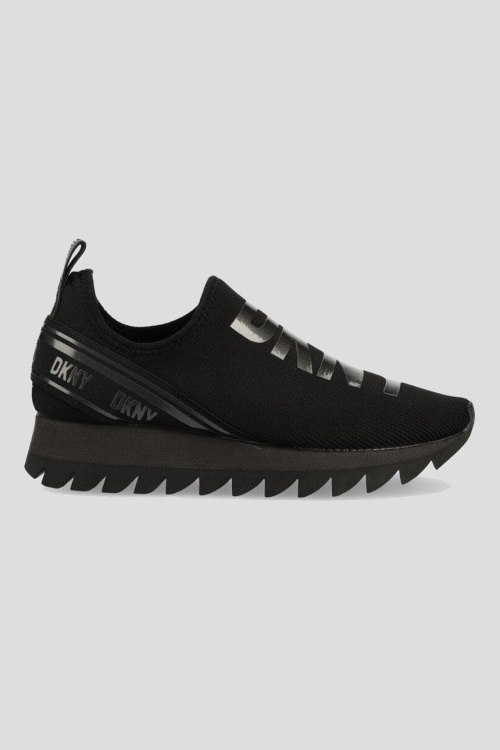 Детали: Женские черные текстильные кроссовки Abbi от Donna Karan (Донна Каран). Закругленный носок, без застежки, принт с логотипом бренда, рельефная подошва, петля для подтягивания, текстильная стелька, уплотненный задник