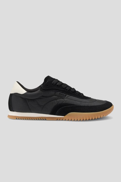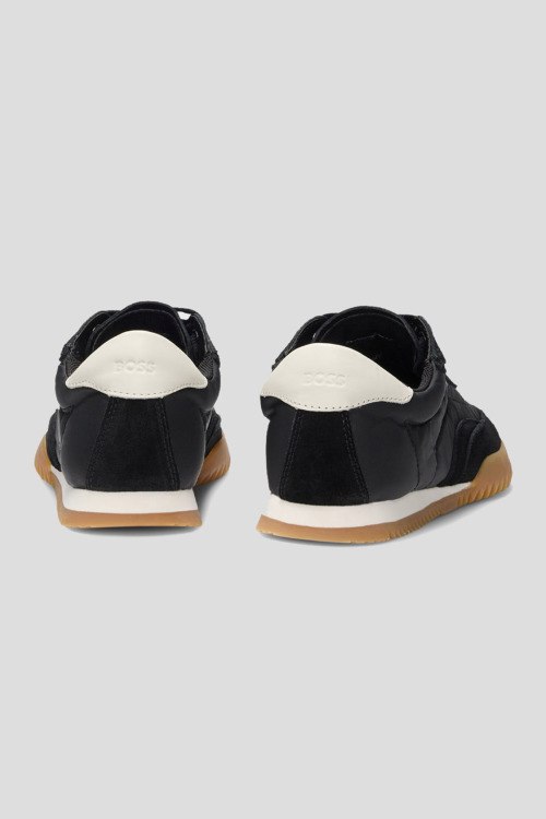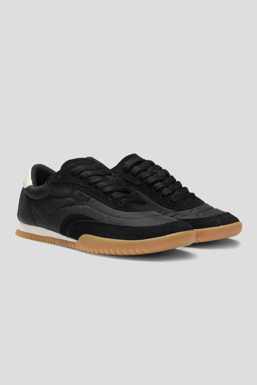 Детали: Женские черные кроссовки из замши и текстиля Carlynn от Hugo Boss (Хуго Босс). Комбинация материалов, логотип сбоку и на язычке, классическая шнуровка, закругленный носок, бежевая подошва