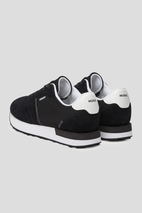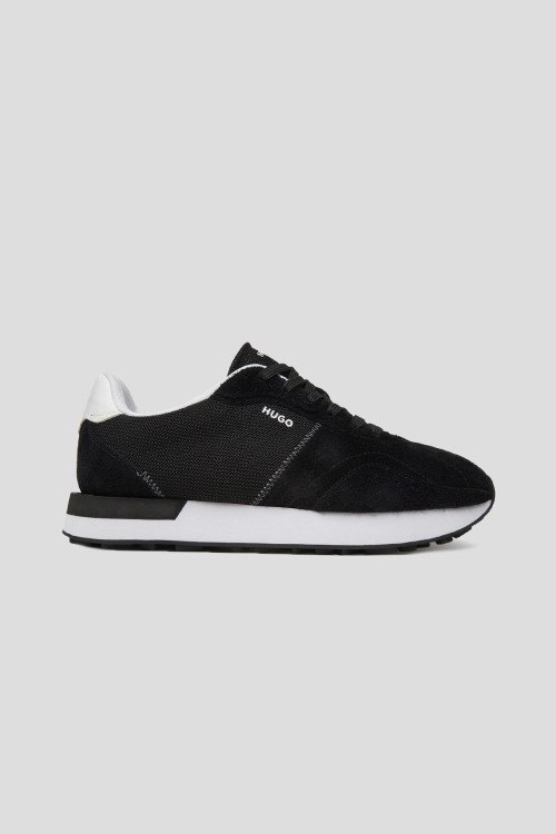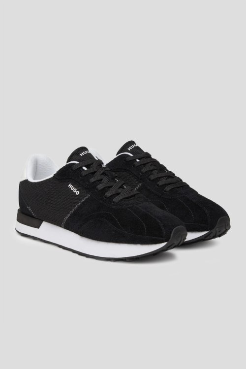 Детали: Женские черные кроссовки из замши и текстиля Kiria Runn от Hugo by Hugo Boss (Хуго бай Хуго Босс). Комбинация материалов, логотип сбоку и на язычке, классическая шнуровка, закругленный носок