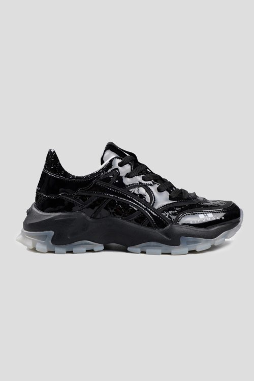Детали: Женские черные лаковые кроссовки от John Richmond (Джон Ричмонд). Глянцевый эффект, тиснение с монограммой, принт с логотипом, классическая шнуровка, закругленный носок, кожаная стелька