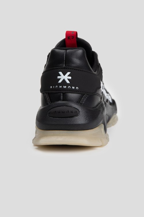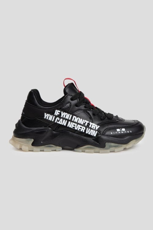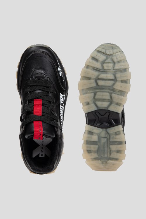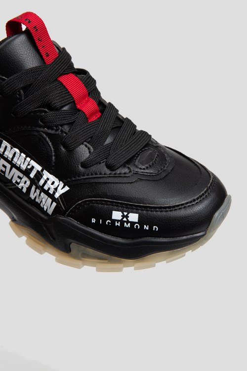 Детали: Женские черные кроссовки из экокожи от John Richmond (Джон Ричмонд). Модель из гладкой кожи, принт с надписью и логотипом, классическая шнуровка, петля для подтягивания на язычке, закругленный носок