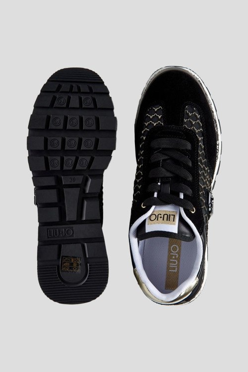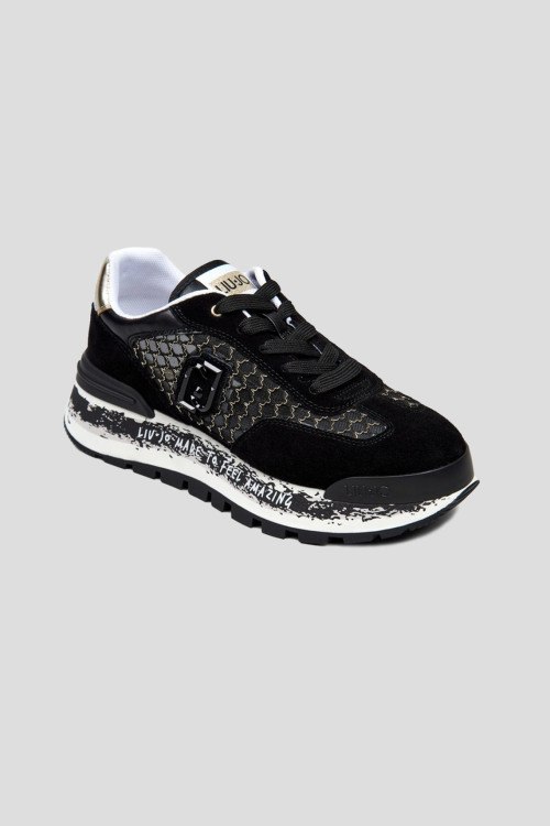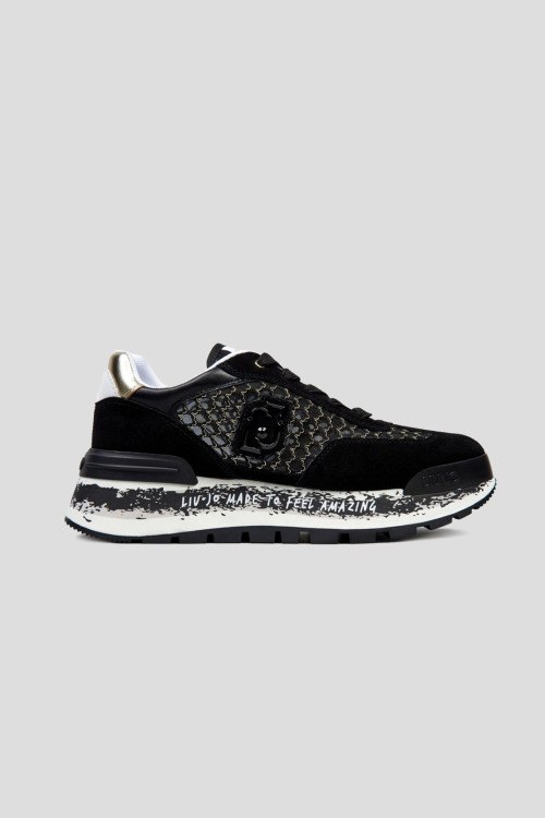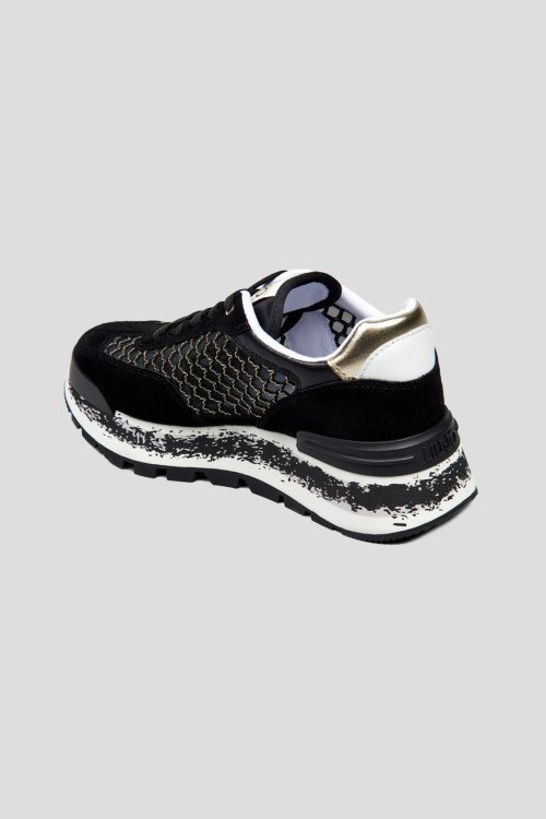 Детали: Женские черные кроссовки из текстиля и замши от Liu Jo (Лиу Джо). Комбинация материалов, закругленный носок, спереди шнуровка, патч-лого, рельефная подошва