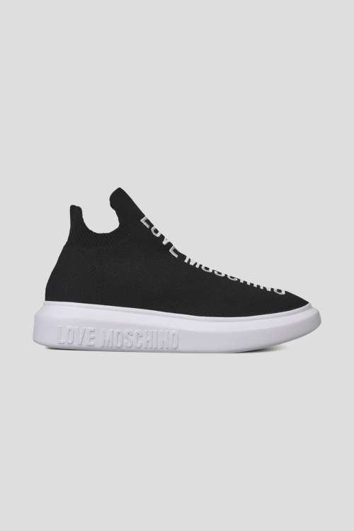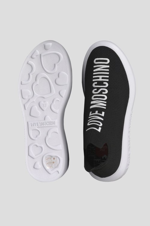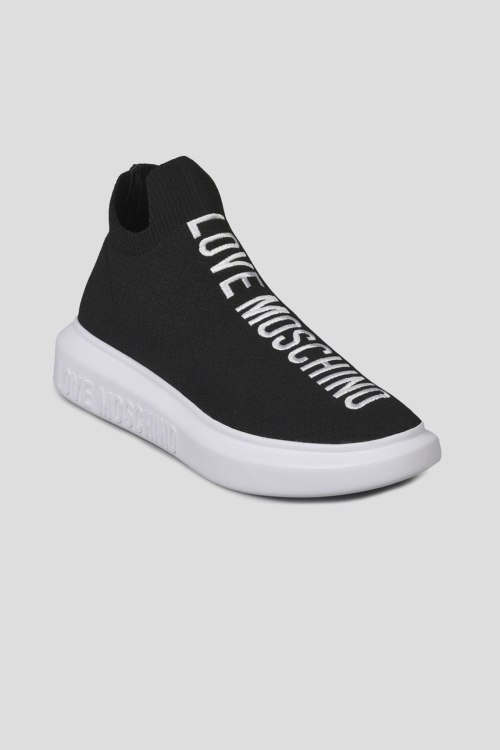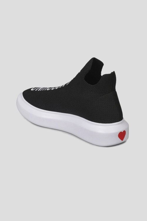 Детали: Женские черные текстильные кроссовки от Love Moschino (Лав Москино). Носочный дизайн, вышитый логотип спереди, закругленный носок, белая брендированная подошва