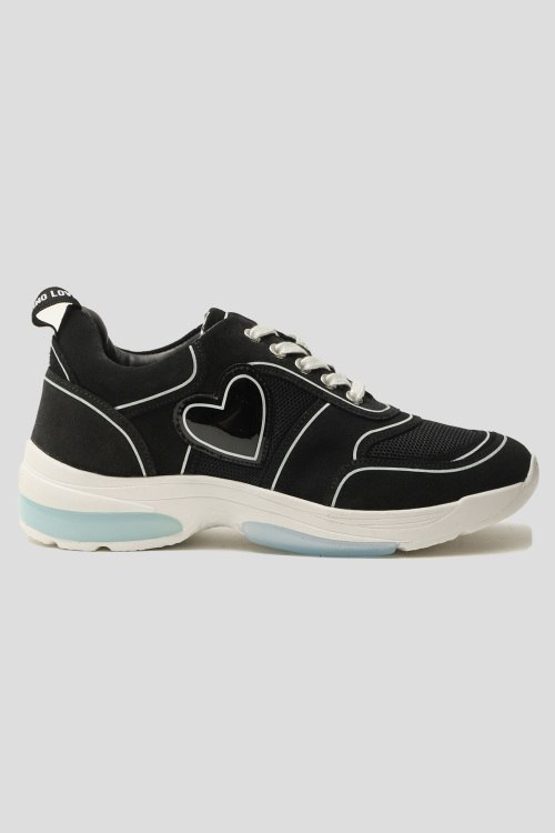 Женские черные кроссовки из натуральной замши и текстиля от Love Moschino (Лав Москино). Комбинированная модель, закругленный носок, классическая шнуровка, контрастные белые полоски, декорированы черным сердечком сбоку, белая подошва с голубыми вставками с тиснением логотипа бренда