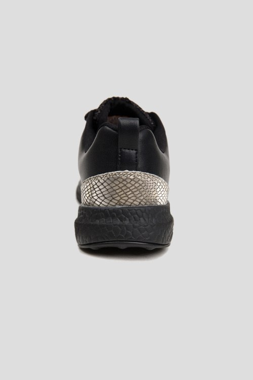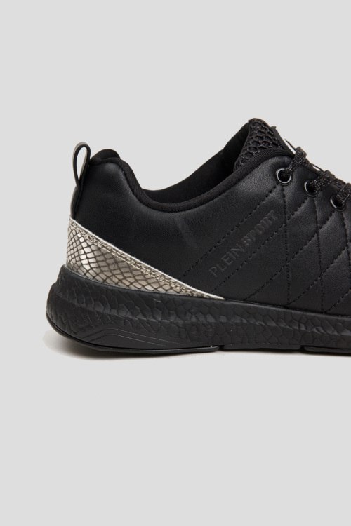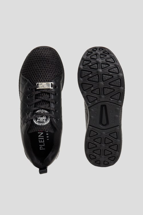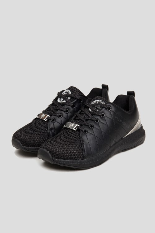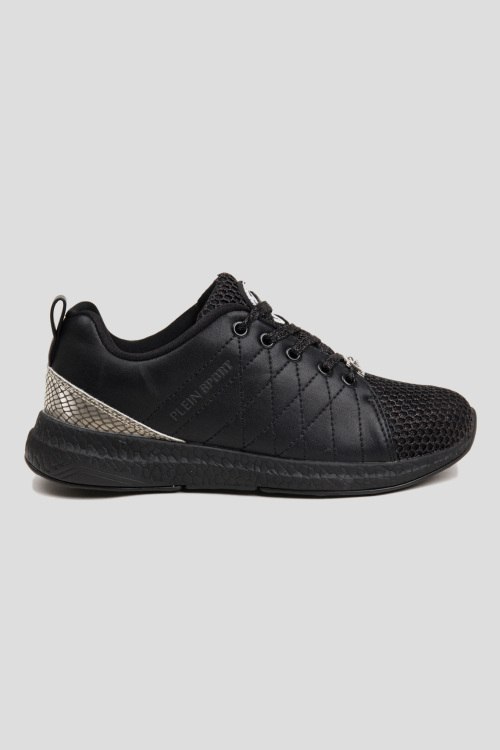Женские черные кроссовки из экокожи и полиэстера от Plein Sport (Плейн Спорт). Комбинированный дизайн, закругленный носок, спереди классическая шнуровка, металлический лого, патч-лого на язычке, резиновая подошва