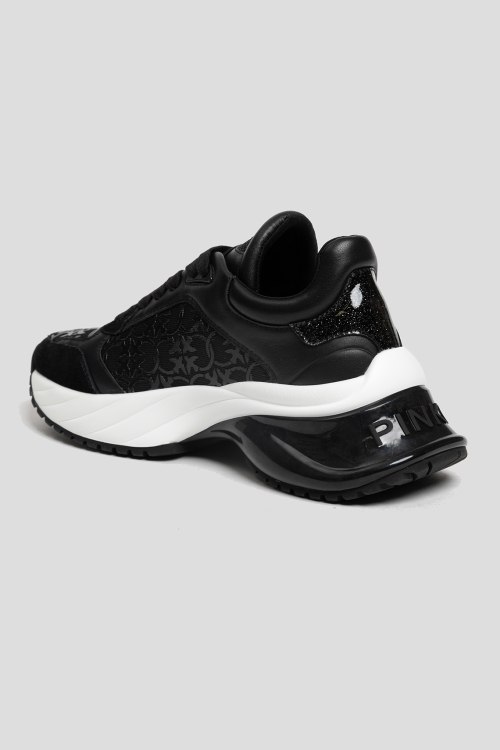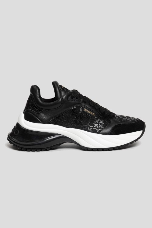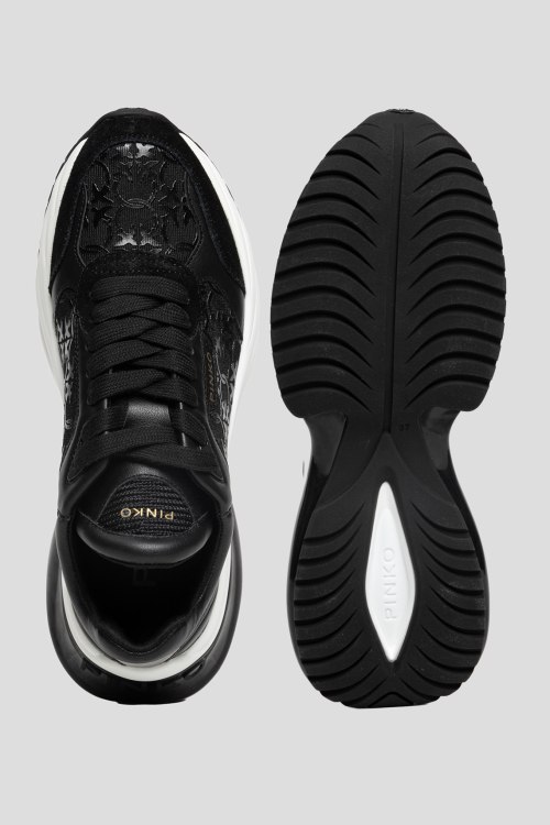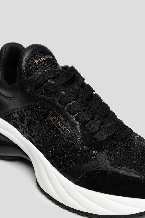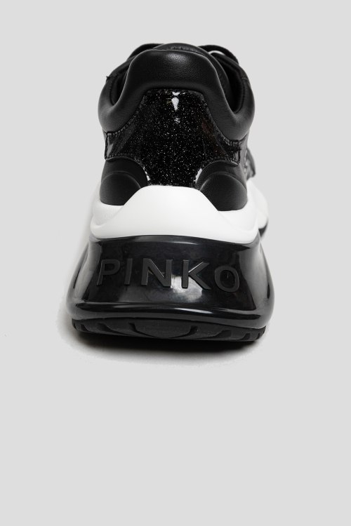 Детали: Женские черные кроссовки Ariel из натуральной кожи и текстиля от Pinko (Пинко). Закругленный носок, комбинация материалов, спереди классическая шнуровка, массивная подошва, патч-лого
