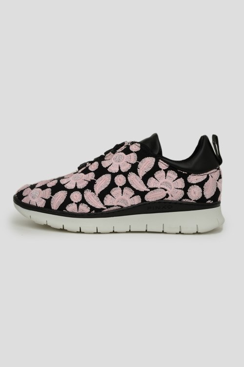Кроссовки черного цвета из текстиля и натуральной кожи. Закругленный носок, рельефная белая подошва, спереди шнуровка. Декорированы цветочной вышивкой