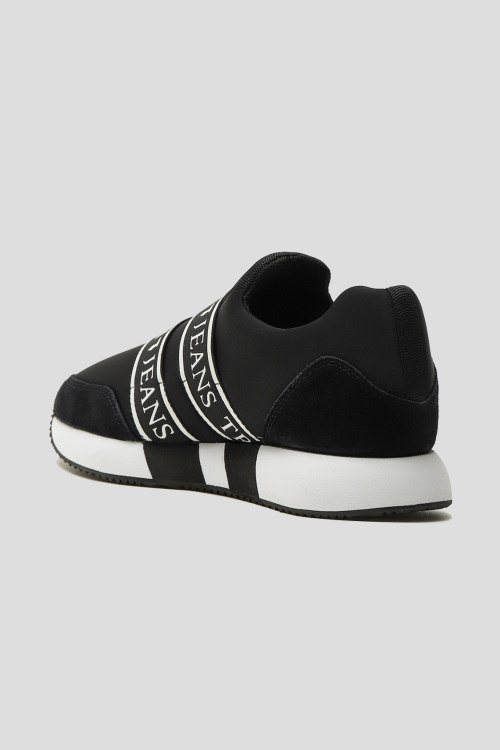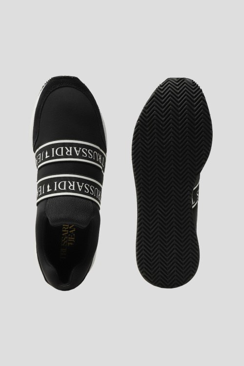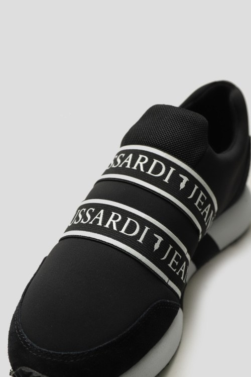 Детали: Женские черные кроссовки из микса натуральной кожи и текстиля с замшевыми вставками от Trussardi (Труссарди). Модель без шнуровки, закругленный носок, контрастная белая подошва, спереди декоративные шлейки с логотипом бренда