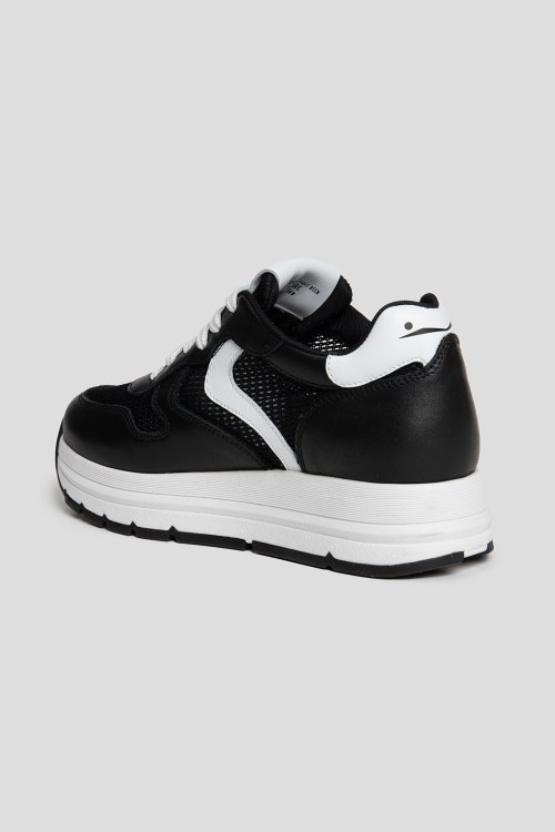 Детали: Женские черные кроссовки из кожи и текстиля от Voile Blanche (Вуаль Бланш). Комбинация материалов, логотип на язычке, классическая шнуровка, закругленный носок, белая завышенная подошва