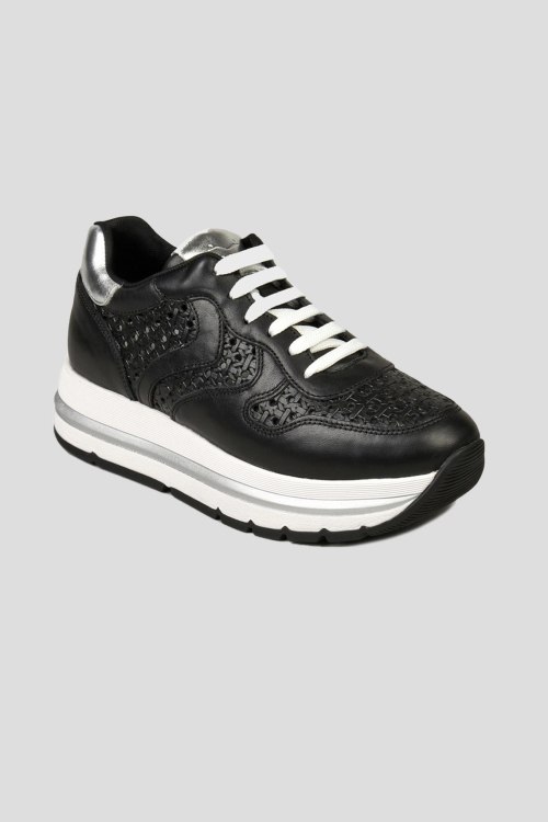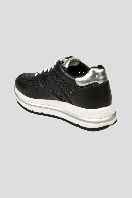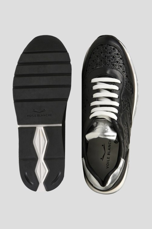 Детали: Женские черные кожаные кроссовки от Voile Blanche (Вуаль Бланш). Модель из гладкой кожи, дизайн с перфорацией, логотип на язычке, классическая шнуровка, закругленный носок