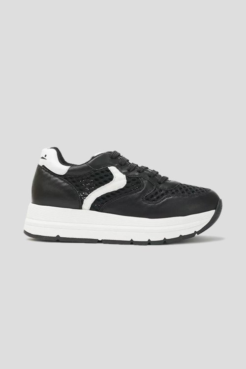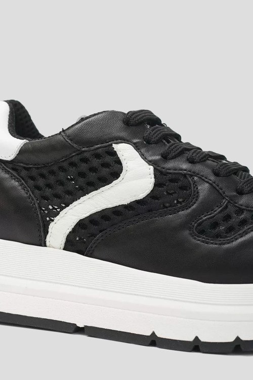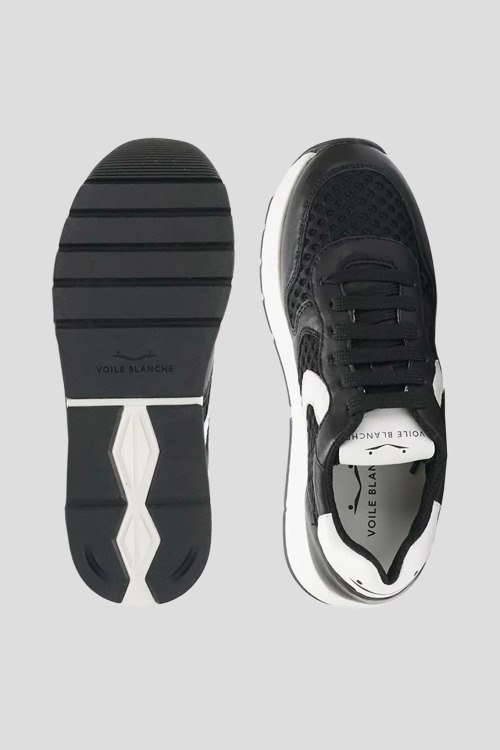Детали: Женские черные кроссовки из кожи и текстиля от Voile Blanche (Вуаль Бланш). Комбинация материалов, логотип на язычке, классическая шнуровка, закругленный носок, высокая белая подошва