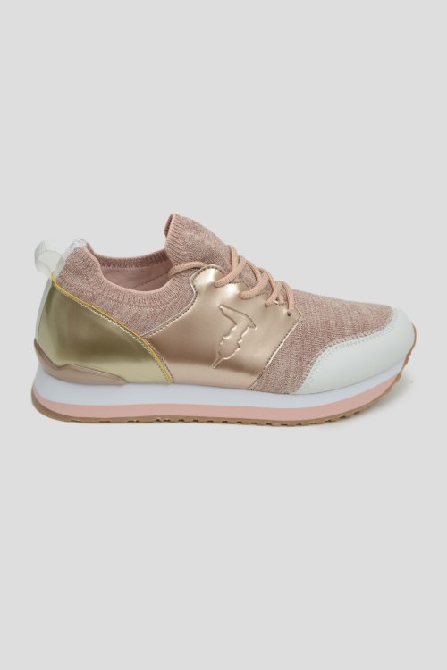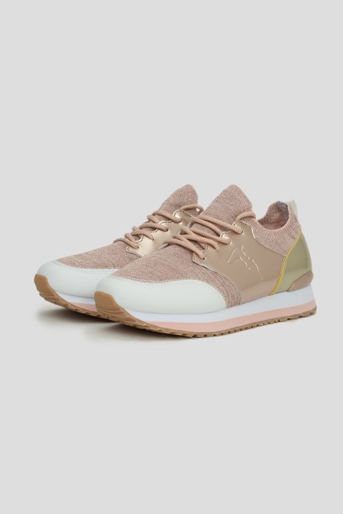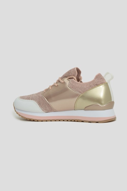 Кроссовки золотистого цвета, закругленный носок, спереди классическая шнуровка, рельефная подошва, петля для подтягивания, фирменный логотип бренда