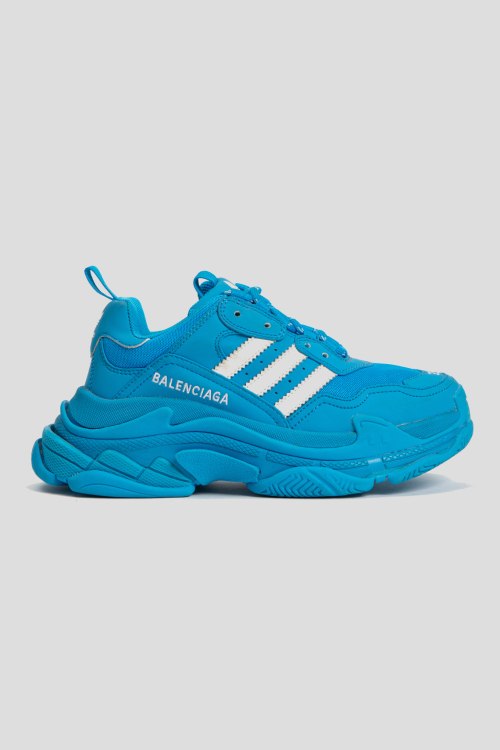 Детали: Женские голубые кроссовки Triple S из текстиля и кожи от Balenciaga (Баленсиага). Модель из коллаборации Adidas x Balenciaga, комбинация цветов и материалов, закругленный носок, спереди шнуровка, принт с размером на носке, массивная подошва, петля для подтягивания