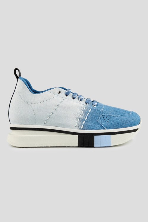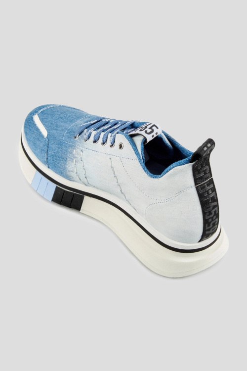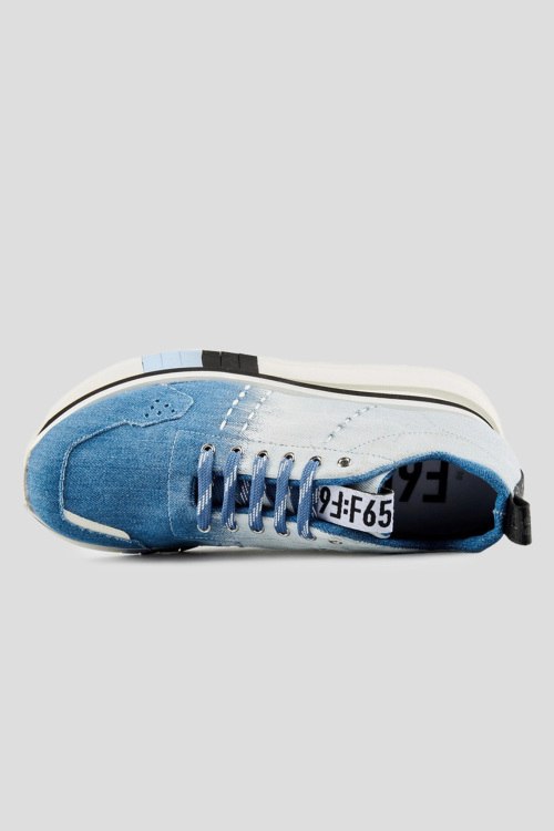 Детали: Женские голубые кроссовки из текстиля от Fabi F65 (Фаби Эф65). Комбинация цветов, закругленный носок, спереди шнуровка, петля для подтягивания, текстильная стелька. Платформа: 4 см