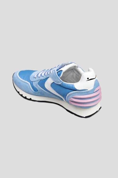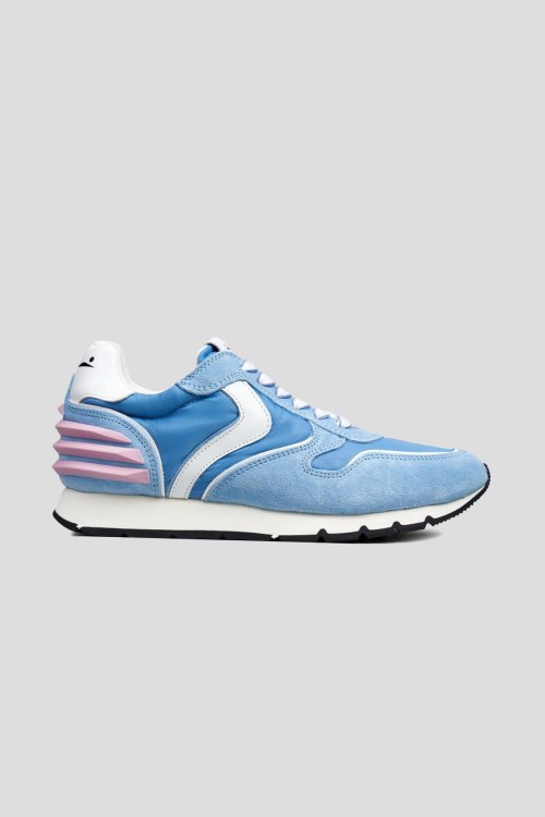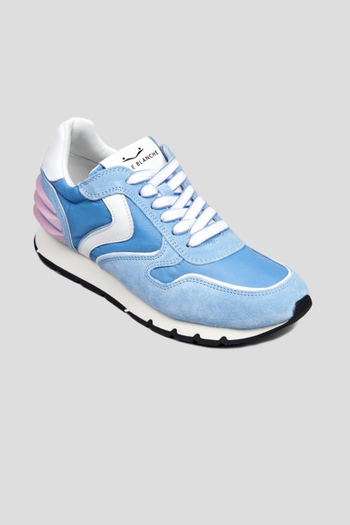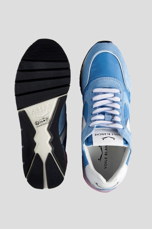 Детали: Женские голубые кроссовки из замши и текстиля от Voile Blanche (Вуаль Бланш). Комбинация цветов и материалов, логотип на язычке, классическая шнуровка, закругленный носок