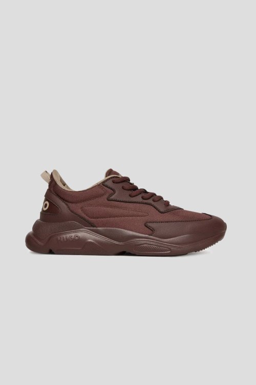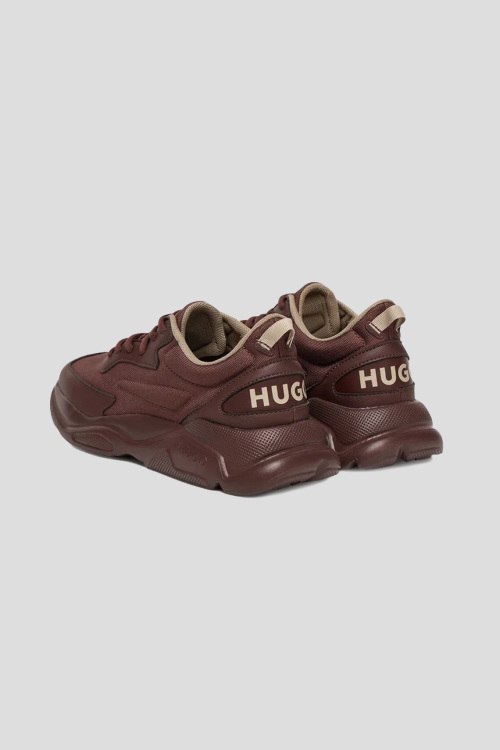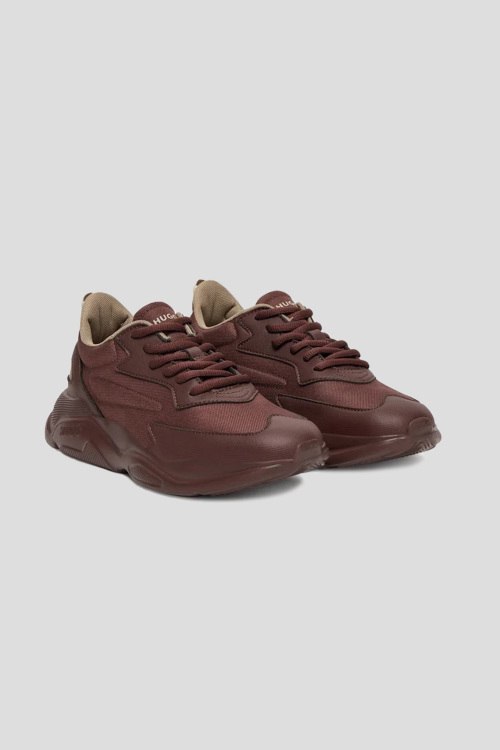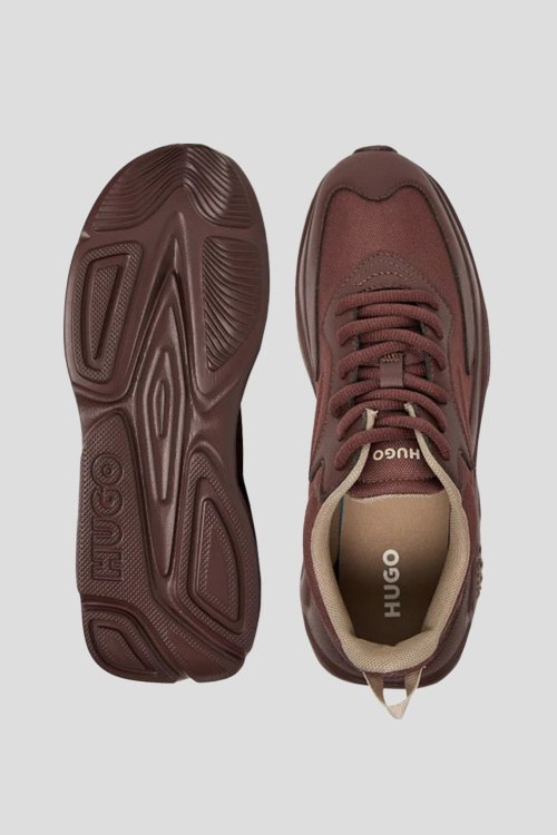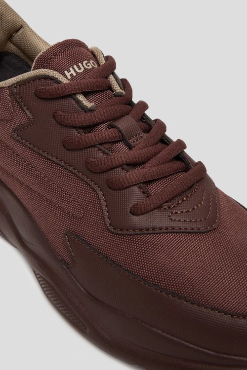 Детали: Женские коричневые текстильные кроссовки Leon Runn от Hugo by Hugo Boss (Хуго бай Хуго Босс). Логотип на язычке и на пятке, классическая шнуровка, закругленный носок, петля для подтягивания сзади, закругленный носок