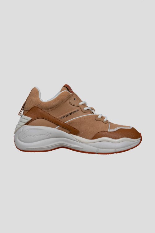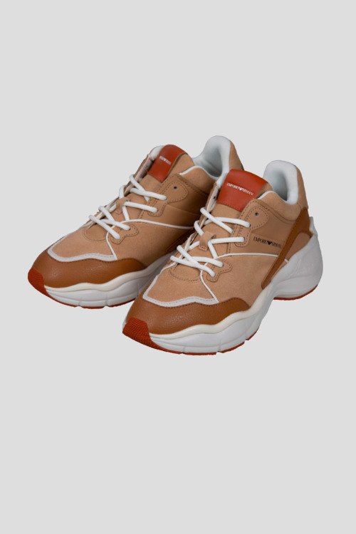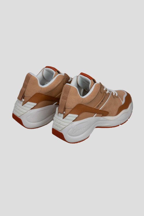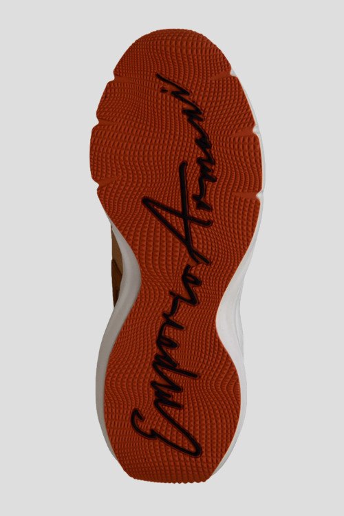 Детали: Женские коричневые кроссовки из натуральной кожи и замши от Emporio Armani (Эмпорио Армани). Комбинированный дизайн, закругленный носок, спереди шнуровка, патч-лого, рельефная подошва, массивная подошва контрастного цвета