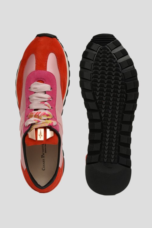 Кроссовки красного цвета из натуральной замши и кожи. Закругленный носок, рельефная подошва, спереди шнуровка. Дополнены брендовой нашивкой и розовыми вставками