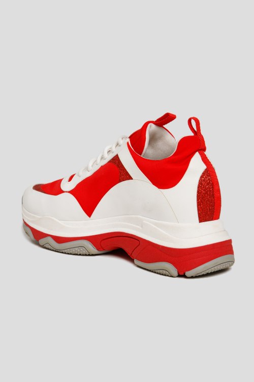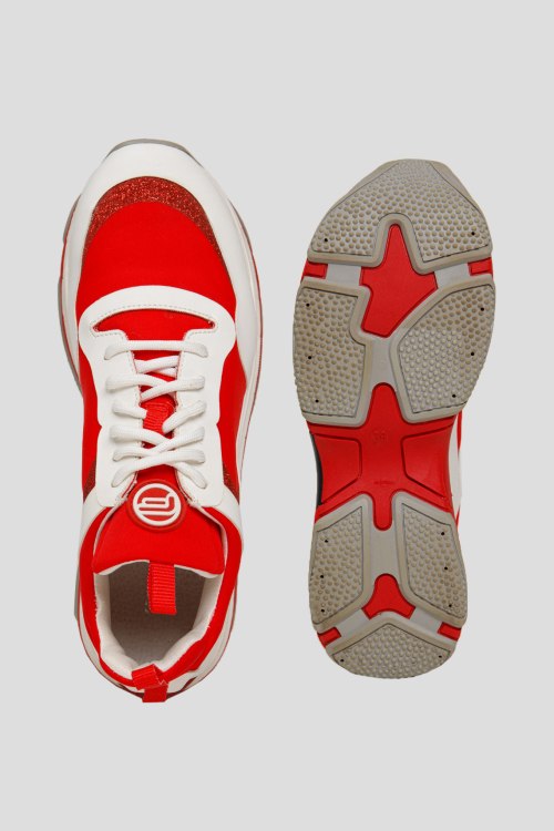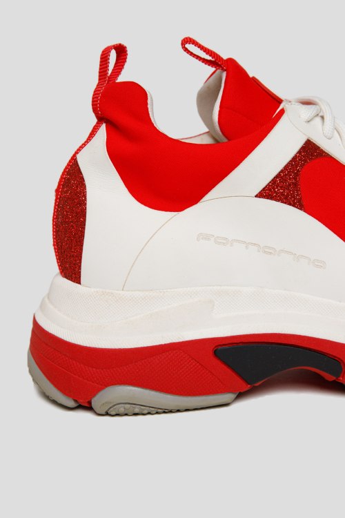 Детали: Женские красно-белые кроссовки из кожи и текстиля от Fornarina (Форнарина). Комбинация цветов и материалов, логотип сбоку и на язычке, две петли для подтягивания, классическая шнуровка, закругленный носок, завышенная подошва. Замеры: высота подошвы 5 см