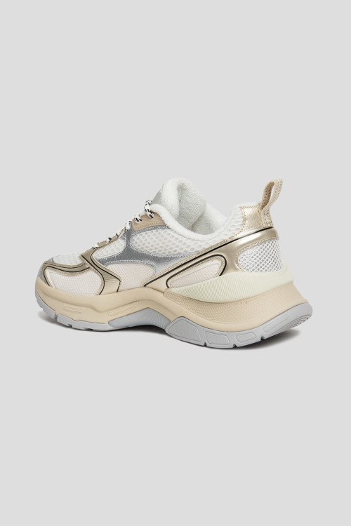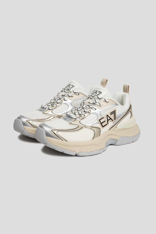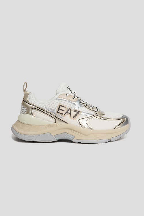 Детали: Женские кроссовки молочного оттенка из полиэстера от EA7 Emporio Armani (ЕА7 Эмпорио Армани). Комбинация цветов и материалов, закругленный носок, спереди шнуровка, петля для подтягивания, логотип бренда