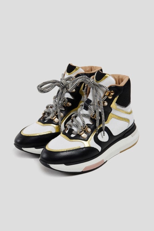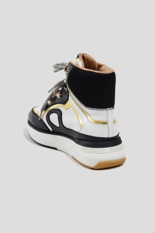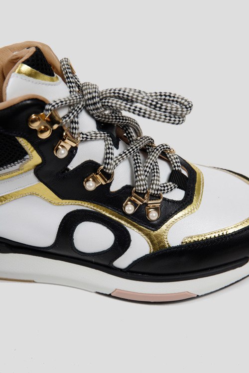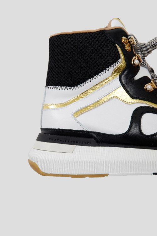 Женские высокие кроссовки Plain sport bia из кожи от Fratelli Rossetti (Фрателли Россети) в бело-черном цвете. Модель идеально подойдет для осени или нехолодной зимы за счет утепленного высокого голенища вокруг щиколотки. Пара завязывается на шнурки, люверсы под которые украшены бусинами в виде жемчужин. Закругленный носок, голенище сзади из текстиля, резиновая подошва з анти скользящими элементами, кожаная стелька с нашитым шелковым шильдом с логотипом. Модель декорирована фурнитурой золотистого цвета и золотистыми кожаными вставками по носку и по бокам. В комплекте дополнительные шнурки и пыльник. Измерения: длина стельки - 24,5 см, высота подошвы: 3 см